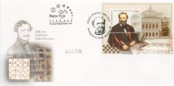"Erkel Ferenc (Gyula, 1810. nov. 7. – Budapest, 1893. jún. 15.) zeneszerző, karmester és zongoraművész. Pályáját zongoraművészként és zenepedagógusként kezdte Kolozs-váron. Pesten 1834-ben mutatkozott be, majd a következő esztendőben véglegesen ott telepedett le. Két éven át a Pesti Városi Német Színháznál, valamint a Budai Magyar Színjátszó Körnél dolgozott karnagyként. 1837-ben a Pesti Magyar Színházhoz, a későbbi Nemzeti Színházhoz került első karmesteri minőségben. 1840-ben írta meg első operá-ját, a Bátori Máriát, melynek szövegkönyvét Egressy Béni írta, aki haláláig (1851) segítőtársa volt operaszerzői munkájában. 1844-ben megnyerte a Kölcsey Ferenc Himnuszának megzenésítésére hirdetett pályázatot. Az 1848–49-es forradalom és szabadságharc után a főváros hangversenyéletének fellendítésén fáradozott. Vezetésével alakult meg 1853-ban a Filharmóniai Társaság, amelyet számtalan esetben vezényelt. Bánk bán című operáját, amely egyben pályájának csúcsát is jelentette, 1861-ben mutatták be. Közreműködött a Zeneakadémia megalapításánál (1875), amelynek tíz éven át igazgatója és zongoratanára volt, majd az Operaház főzeneigazgatója lett. Karmesterként és szervező egyéniségének köszönhetően rendkívül sokat tett a főváros zenei életének felvirágoztatása érdekében. Nevéhez fűződik a magyar nemzeti opera megteremtése, de karműveket, dalokat, kísérőzené-ket, zongoradarabokat, zenekari műveket is komponált. Gazdag életműve példaértékű. Erkel Ferenc amellett, hogy kiváló sakkozó volt, tevékeny részt vállalt a hazai sakkélet szervezésében is. Tagja volt az 1839-ben megalakított első Pesti Sakk-körnek, majd annak 1849-es betiltása után az 1864-ben újra megalakított körnek alelnöki, később elnöki feladatait látta el. Az 1850-es évek közepétől – először Szén Józseffel együtt, majd annak halála után Récsi Emil társaságában – az 1860-as évek elejéig a magyar sakkozók legjobbjaként tartották számon. Korosodva mind ritkábban játszott, 1875 körül abba is hagyta a játékot, de a sakk-körbe rendszeresen bejárt, klubtársaival beszélgetett, nézte játszmáikat, feladványokat fejtett. (Forrás: www.filharmonia.com * www.wikipedia.org * Bottlik Iván írása) A sorszámozott blokk bélyegképén az alkotóművész Erkel Ferencet ábrázolta. A keretrajzon látható grafikai kompozíció alkotóelemei az Operaház épülete, kották és egy sakktábla részlet. A blokkhoz tartozó alkalmi borítékon Erkel portréja, az Operaház, valamint egy – Erkel Ferenc győzelmével végződő – Erkel-Szén sakkjátszma befejezése látható. Az alkalmi bélyegző grafikáján a portré stilizált rajza található."