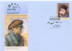 A sorozathoz tartozó alkalmi borítékokat a művészek egy-egy alkotása – Koszta József: Mákvirágok (1910-es évek, Koszta József Múzeum, Szentes) és Rippl-Rónai József: Utolsó önarckép (1927, Magyar Nemzeti Galéria) –, az alkalmi bélyegzőt pedig aláírásuk díszíti. Koszta József (Brassó, 1861. március 27. – Budapest, 1949. július 29.) festészeti tanulmányait a Mintarajziskolában kezdte, majd a Müncheni Akadémián folytatta. Hazatérése után a Benczúr Gyula Mester-iskola növendéke lett és neves festők – Lotz Károly és Székely Bertalan – tanították. Több díj és kiállítás után 1902-1903 során Nagybányán alkotott. Tanulmányutakat tett Párizsba, Rómába és Hollandiába. Visszatérése után a Szolnoki Művésztelep tagja lett. Visszahúzódó természetéből fakadóan közel 30 évig egy Szentes melletti tanyán élt és alkotott. 1937-ben a Szinyei Merse Pál Társaság tiszteletbeli tagjává választotta. Műveiben főként a paraszti életet és az alföldi tájakat dolgozta fel. Erőteljesen használta a fény-árnyék adta lehetőségeket, erős tónusos színeket alkalmazott. Ábrázolásmódjára leginkább a drámai, expresszív realista formázás jellemző. Portrék, csendéletek és tájképek alkották munkássága gerincét. 1948-ban Kossuth-díjat kapott. Képeit a szentesi múzeumra hagyta, amely hálából 1949-ben felvette nevét. Rippl-Rónai József (Kaposvár, 1861. május 23. – Kaposvár, 1927. november 25.) magyar festő, grafikus. Kaposváron volt patikussegéd, majd Budapesten gyógyszerészeti mesteroklevelet szerzett. 1882-ben házitanítóskodott, és rajzórákat vett. 1884-től a müncheni Művészeti Akadémián, majd 1887-ben Párizsban Munkácsy Mihálynál tanult, később segédje lett. Festészetén eleinte meglátszott Munkácsy hatása, de franciaországi tartózkodása alatt új stílus-irányzatokkal is megismerkedett. Hazatérése után, 1902-ben Kaposváron telepedett le. Alapító tagja volt a Magyar Impresszionisták és Naturalisták Köre (MIÉNK) csoportnak, és részt vett a Nyugat mozgalmában is. A festészeten kívül üvegablakok tervezésével és készítésével is foglalkozott. 1912-ben ő készítette az Ernst Múzeum nagyméretű üvegablakát. Az I. világháború kitörésekor 1914-ben Párizsban elfogták és internálták, 1915-ben tért haza Kaposvárra. A posztimpresszionista és szecessziós törekvések legjobb magyarországi képviselőjeként tartják számon. Festészetére gazdag színvilág, stilizáló vonalak és dekorativitás jellemző. Az 1900-as évek elején finom pasztell technikájú képeket festett. Kialakított egy sajátos stílust, amit „kukoricás”-nak nevezett: a festéket vattaszerűen, foltos felrakásokkal hordta fel vásznaira. Kaposváron tiszteletére Rippl-Rónai művészeti díjat alapítottak, 1978-ban pedig megnyílt a Rippl-Rónai József-emlékmúzeum..(Forrás: hu.wikipedia.org)