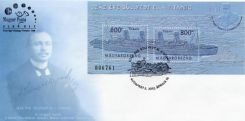 The main motif of this unusual philatelic product is the Titanic heading towards the iceberg, while the stamps show parts of the liner. In the top right corner there is a portrait of Dr Lengyel and the outline of RMS Carpathia. The unusual feature of this release is that, in addition to offset printing and embossing, iridescent spot-varnish screenprinting, usually a security device, has been used and the particles scattered across the surface sparkle icily. The first day cover for the block features a portrait of Dr Árpád Lengyel, while the silhouette of a lifeboat has been used for the special postmark.