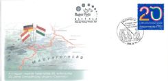"On 2 May 1989 dismantling the fence built to prevent illegal border crossings on the Hungarian-Austrian border began. On 19 August several thousand people took part in the Pan-European Picnic near the border at Sopron, where the creation of a Europe without borders was urged. On 10 September 1989 the Hungarian government announced its decision to allow from 11 September 1989 East German nationals staying in Hungary who did not wish to return home to travel to any other country that was willing to accept them or let them travel through. On the 20th anniversary of the event known as the border opening that made history, Hungary, Austria and Germany are jointly releasing a stamp. The special feature of the stamps issued in all three countries is that they are all based on a design by the Hungarian graphic artist Imre Benedek. The stamps have a blue background while the main motif is the number of the anniversary of the event with a graphic composition using the national colours of all three countries supplemented by a message referring to the historic border opening. The graphic design of the first day cover shows a detail of a map and the national colours of the three countries, while the special postmark is a stylised depiction of a border crossing. A special commemorative card presenting the stamps of the three countries together has also been made, which shows the new stamps together with the special postmark. The front of the commemorative card – matching the graphic design of the first day cover – is illustrated by a map detail and the national flags. "