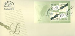 "In Magyar Posta’s miniature sheet two different but related stamps are shown diagonally and rotated. The stamp de-signs have motifs referring to letter-writing. The HUF 100 stamp shows an envelope, writing paper and a decorative letter “A”, while the main motif of the HUF 230 stamp is the nib of a pen. In the frame of the miniature sheet there is a graphic composition suggesting a handwritten letter. In the continuously repeated text the following phrase occurs again and again in Hungarian, English and French: “Levél, levél-írás, letter, letter-writing, lettre, écrire une lettre, …”. The composition is completed by an inkwell and a quill. The motifs used in the frame are repeated on the first day cover and postmark."