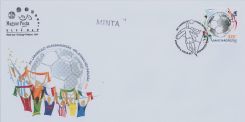" This is the first time the event is being held in Africa and, after it has taken place, Oceania will be the only geographical region not to have organised the world championship. After the qualifiers, of the 204 countries entering the competition out of the 208 members of FIFA, 32 teams will vie for the world championship. They are Algeria, Argentina, Australia, Brazil, Cameroon, Chile, Côte d’Ivoire, Denmark, England, France, Germany, Ghana, Greece, Honduras, Italy, Japan, Korea DPR, Korea Republic, Mexico, Netherlands, New Zealand, Nigeria, Paraguay, Portugal, Serbia, Slovakia, Slovenia, South Africa (host), Spain, Switzerland, Uruguay and the United States of America. Africa won the right to stage the tournament thanks to FIFA’s rotating system in which FIFA itself designated the continent. Egypt, Morocco, the Republic of South Africa, and Tunisia and Libya with a joint bid competed for the right. The result was announced by Joseph Blatter, the president of the FIFA, in Zurich on 15 May 2004. The Republic of South Africa’s bid won more than 50% of the votes in the first round, and thus secured the right to stage the World Cup. The official mascot of the World Cup is Zakumi, a leopard. The name is a combination of ZA, the Afrikaans abbreviation of Zuid Afrika, and “kumi”, meaning ten in several African languages. Zakumi symbolises the people living there, and the geography and spirit of the Republic of South Africa. The official ball for the World Cup was unveiled at the draw for the world championship on 4 December 2009. It is named Jabulani, which means “to celebrate” in Zulu. The ball has 11 different colours, which symbolise the 11 regions and official languages of South Africa as well as the 11 players of each team starting a match. Its makers believe it is the roundest ball of all time. (Source: hu.wikipedia.org) The main motif of the design of the stamp is a football with the outlines of the continents referring to the world football championship. As part of the individual graphic composition there are figures dressed in the strips of different nations in poses reflecting movements typical of football. The commemorative first day cover shows a crowd of fans celebrating in keeping with the style and spirit of the stamp design. The design of the special postmark is a combination of a player and a football pitch."