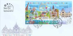 "Budapest’s City Park is in the capital’s District XIV and was built for the city’s celebrations of the millennium of the Conquest of Hungary. This was when the lake in the City Park was regulated, two channels of the Páva Island were filled in and the Rákos Stream was led into the lake. The City Park Boulevard was made, and Vajdahunyad Castle and Heroes’ Square were built. Although constructed at the time of the 1896 Budapest world exposition, many entertainment and cultural facilities were added which have been in use to the present day. Behind Heroes’ Square are the Ice Rink, Boating Lake and Vajdahunyad Castle, home to the Museum of Hungarian Agriculture. A boulevard skirts the lake, on which the Budapest Zoo and Botanical Garden lies with a splendid range of flora and fauna. Here Budapest’s thermal baths with the deepest borehole and hottest water, the Széchenyi Baths, can be found. Opposite the Baths is the round building of the Budapest Grand Circus, where the first performance was held in 1891. Next to the Circus is the Funfair, which has been operating in its present form since 1950 but its history dates back to the early 1800s. (Source: budapest.com * hu.wikipedia.org) The stamp designs of the miniature sheet show the well-known sights of the City Park in a characteristic graphic composition, which are in the order of the stamps the Budapest Zoo and Botanical Garden, the Funfair, Vajdahunyad Castle, the Ice Rink and the Boating Lake. The second and fourth stamps in the miniature sheet contain a surcharge. Magyar Posta devotes the proceeds from the surcharge to supporting youth stamp collecting. The amount of the surcharge may not be used to pay for postage. The silhouette of the building of the Széchenyi Baths ap-pears on the first day cover for the miniature sheet and the design of the special postmark employs a stylised picture of balloons."