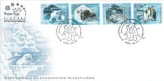 The focal point of the subject is the preservation of the polar regions and glaciers. The postal administrations of the countries participating in the campaign can choose the motifs for the stamp design, the date of issue and many other details as they think fit. Apart from the topic and the name, a common feature is the official emblem symbolising an ice crystal, the creation of the Finnish graphic designer Saku Heinänen. Magyar Posta is contributing to the realisation of the common design theme by issuing a numbered block with two stamps, and is supplementing this by a four denomination set of stamps presenting the fauna of the polar regions. The stamp designs of the block shows a polar bear and an arctic fox, while in the frame there are a whale, a seagull, a beluga whale, a narval, a puffin and seals. On the stamps of the set a polar bear, a musk ox, a snow leopard and king penguins are depicted in their natural environment. For the first time in stamp issuing traditional offset printing has been supplemented by iridescent spot-varnish screen printing, which is used in the manufacture of security products. Thanks to this, there are tiny silky, sparkling areas scattered on the stamp block, recalling the original, frosty atmosphere of the polar regions. The set of stamps is released in both offset and silk finish versions. In the spirit of the stamps on the first day cover a seal cub resting on a block of ice is portrayed. The design of the special postmark is the logo for the block of stamps and a stylised drawing of penguins for the set of stamps.
