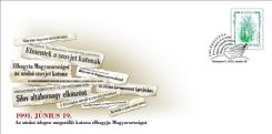 "On 10 March 1990 the Hungarian Foreign Minister Gyula Horn and his Soviet counterpart Eduard Shevardnadze signed the agreement on the withdrawal of Soviet troops from Hungary in Moscow. According to the agreement, all personnel including Soviet civilians together with all armaments, military technology and materiel had to leave the country by 30 June 1991. During this period movements related to military exercises of Soviet troops including flying were restricted. On 12 March 1990 the withdrawal of the soldiers, civilian employees, arms, military technology and materiel of the southern corps of the Soviet army temporarily stationed in Hungary started with the tank units based at Hajmáskér. This was in effect completed on 16 June instead of 30 June 1991. The last military train left the country on 16 June 1991. The Hungarian Parliament adopted the bill on the significance of regaining the country’s freedom and on the Day of Hungarian Freedom on 8 May 2001, which declared 19 June to be a national remembrance day and the last Saturday of June to be the Day of Hungarian Freedom. (Source: fn.hu) The cover commemorating the anniversary shows a montage made of headlines from the dailies 20 years ago. The cover bears the postage stamp Protected Hungarian Flowers: Cloth of Gold Crocus issued in 2009, which is cancelled by a commemorative postmark with a graphic design symbolising the withdrawal."