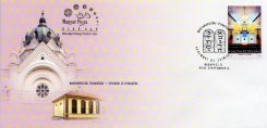 "New Synagogue in Szolnok On the HUF 175 stamp of the set the altar of the New Synagogue in Szolnok is depicted, while the buildings of the old synagogue, today a museum, and the new synagogue are shown on the first day cover. The postmark is a stylized drawing of the stone tablets of the Ten Commandments. The Israelite congregation of Szolnok was established in 1850. The synagogue built in 1898-99 stands on Koltói Anna Square. It was constructed based on the designs of Lipót Baumhorn. It was used as a place of worship until 1940, and it was restored by the municipality in 1960, since when it has functioned as a gallery. The construction of the New Synagogue began in 1931 and had room for 250 to 300 people. In 1935 Dr József Hasznos, the leader of the congregation at the time, and Dr Kornél Heves, the chief rabbi, consecrated the building, and named it the Temple of Martyrs. (Source: www.szolnok.varosom.hu * Varga, Béla: A History of the Jews of Szolnok)"