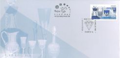 "The history of Ajka crystal glass began in the middle of the 19th century in the glass kilns in the forests of the Bakony Hills. In 1878 Bernát Neumann brought glass-makers from Bavaria and Saxony to Ajka, where he had established a manufactory, still operating today, to work alongside local glass trade craftsmen. According to an 1879 treasury report, concave glass, ordinary glass and lamp chimneys were made there. In 1891 the works came into the hands of the financially strong company Kossuch. In this period Ajka glass was already traded in Germany, East India and North America. The factory ceased production in 1914 due to a shortage of labour, and restarted in March 1916, lighting a single furnace. The supply of raw materials was problematic after the Second World War and lack of coal brought production to a standstill once more. Operations were resumed in October 1946 and the works was nationalized in 1948. In the 1960s and 1970s the factory floor was expanded and the making of lead crystal began. Generator gas was substituted by natural gas for firing, while the potter’s kilns were replaced by bath furnaces ensuring continuous melting. After privatisation in 1990, technical development on an unprecedented scale and dynamic growth in production typified the business. Since then, environment friendly electric glass melting that ensures high-quality glass has been introduced along with combined colour products and hand painted glass. In order to increase production, a second facility specializing in making potash crystal was built in Ajkacsinger. A studio for porcelain painting at artistic standards was opened in 1991. 96% of Ajka products are exported, mainly to the United States of America and Western Europe, but Ajka glass is also popular in Japan and South-East Asia. (Source: ajka-crystal.hu) Details of superbly crafted examples of Ajka crystal with great artistic merit made in clear, polished, painted and colour-combined glass are shown on the special postage stamp and its first day cover – glasses, goblets, decanters, jugs, dishes and glass ornaments. The design of the postmark employs the stylised form of a piece of crystal glass."