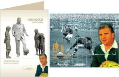 To mark this occasion, Magyar Posta and Lemezbörze,...plusz magazine are releasing one thousand copies of a special version of the commemorative sheet In memoriam Ferenc Puskás, jointly issued in 2007. The silhouette of the group of figures comprising the statue, and the date and place of the unveiling are overprinted in gold leaf. The commemorative card for the commemorative sheet has a description in Hungarian, English and Spanish. Ferenc Puskás, the legendary footballer was affectionately known as “Öcsi”, meaning Buster, by Hungarians. He played for Kispest AC, which later became the Hungarian army team Budapest Honvéd FC, the Hungarian national team and Real Madrid, and then became a successful trainer at Panathinaikos. During his career he taught young people all over the world to respect football, setting an example for several generations. It is no coincidence that the group of figures comprising the statue made in his honour, which was inspired by a photograph, unusually depicts a street scene showing him teaching children how to control the ball. The sculpture, which has no pedestal, is on the Óbuda-Újlak promenade, and is the first full-figure statue of Puskás in the world. The work is the legacy of the sculptor Gyula Pauer, and the figures of the children were made by the sculptor Dávid Tóth. (Source: Statue unveiling 2013 commemorative card)