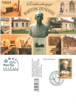 In 1988 the mortal remains of Béla Bartók were brought back to Hungary and interred in the Farkasrét cemetery. On the 20th anniversary, Magyar Posta is releasing a commemorative postcard of the Bartók Music House in Ráko-shegy. The commemorative postcard with a HUF 70 stamp impression was designed using the photographs of György T. Szántó and the graphic designer András Andor. On the picture side of the postcard there are exterior and interior details of the Bartók Music House in Rákoshegy with a bust of the composer by József Ács in the centre. The stamp design of the postcard has a detail of the panel painting “Béla Bartók” by István Fillencz on the top