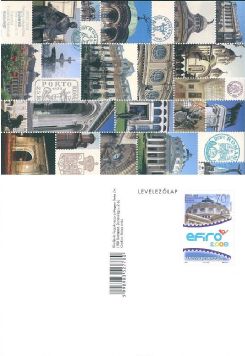"On the picture side of the commemorative postcard with a stamp impression of HUF 70 there is a graphic design resembling a sheet of stamps with imitation perforations showing Bucharest’s sights and pictures of Romanian cancellations. The stamp design of the commemorative postcard features the Romanian Athenaeum and the event’s official logo. The latter in a stylized form also provides the design of the special postmark."