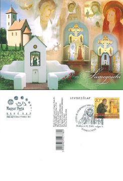 On the picture side of the card the memorial chapel, Mary’s Fountain and the interior of the chapel are shown. In the inte-rior space of the chapel the nave is divided from the chancel by double doors, which show the annunciation when shut. The Virgin Mary is on the right door while the Archangel Gabriel is on the left. When the doors are open, the biblical scene of Jacob’s dream can be seen with angles going up and down the ladder between heaven and earth. Above the chancel there is Christ’s cross which has rounded ends with depictions of the Holy Trinity vertically, and the mater dolorosa and St John horizontally. Beneath the cross to the right is St Francis and to the left the figure of John H. Newman, after whom the chapel is named, praying. The pictures were painted by Kossuth Prize winning artist Erzsébet Udvardi. The stamp design of the commemorative postcard shows John H. Newman (1801-90) with the memorial chapel in the background. The graphic design of the postmark is a stylized drawing of a decorative detail over the entrance of the chapel.