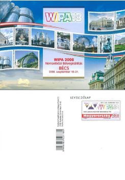On the picture side of the commemorative postcard with a stamp impression of HUF 70 there is a striking graphic composition depicting some of the sights of the Austrian capital hosting the event. The stamp design of the commemorative postcard uses the logo of WIPA 2008. The logo in a stylized form is featured in the design of the special postmark.
