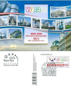 On the picture side of the commemorative postcard with a stamp impression of HUF 70 there is a striking graphic composition depicting some of the sights of the Austrian capital hosting the event. The stamp design of the commemorative postcard uses the logo of WIPA 2008. The logo in a stylized form is featured in the design of the special postmark.
