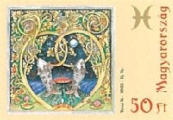 The centre point of the works, made in a form reminding one of medieval codex art, contains the individual signs of the zodiac with the associated astrological symbols, e.g.: planets, minerals, plants, etc. All the signs of the zodiac can be found on the stamp pictures. From left to right and from top to bottom the order is the following: Capricorn, Aquarius, Pisces, Aries, Taurus, Gemini, Cancer, Leo, Virgo, Libra, Scorpio and Sagittarius.