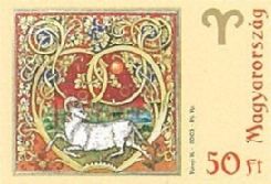 The centre point of the works, made in a form reminding one of medieval codex art, contains the individual signs of the zodiac with the associated astrological symbols, e.g.: planets, minerals, plants, etc. All the signs of the zodiac can be found on the stamp pictures. From left to right and from top to bottom the order is the following: Capricorn, Aquarius, Pisces, Aries, Taurus, Gemini, Cancer, Leo, Virgo, Libra, Scorpio and Sagittarius.