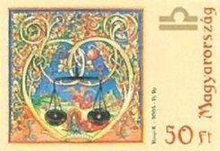 The centre point of the works, made in a form reminding one of medieval codex art, contains the individual signs of the zodiac with the associated astrological symbols, e.g.: planets, minerals, plants, etc. All the signs of the zodiac can be found on the stamp pictures. From left to right and from top to bottom the order is the following: Capricorn, Aquarius, Pisces, Aries, Taurus, Gemini, Cancer, Leo, Virgo, Libra, Scorpio and Sagittarius.