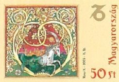 The centre point of the works, made in a form reminding one of medieval codex art, contains the individual signs of the zodiac with the associated astrological symbols, e.g.: planets, minerals, plants, etc. All the signs of the zodiac can be found on the stamp pictures. From left to right and from top to bottom the order is the following: Capricorn, Aquarius, Pisces, Aries, Taurus, Gemini, Cancer, Leo, Virgo, Libra, Scorpio and Sagittarius.